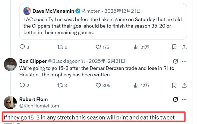 这件事的起因还要追溯到一个多月前,快船主帅泰伦-卢曾在12月21日表示,他向球队提出了剩余赛程拿下35胜20负的目标。彼时,快船的战绩仅为6胜21负。弗洛姆当时在社媒上回应卢的这一目标时写道:“如果快船本赛季能打出一波15胜3负的战绩,我就把这条推文打印出来吃掉。”