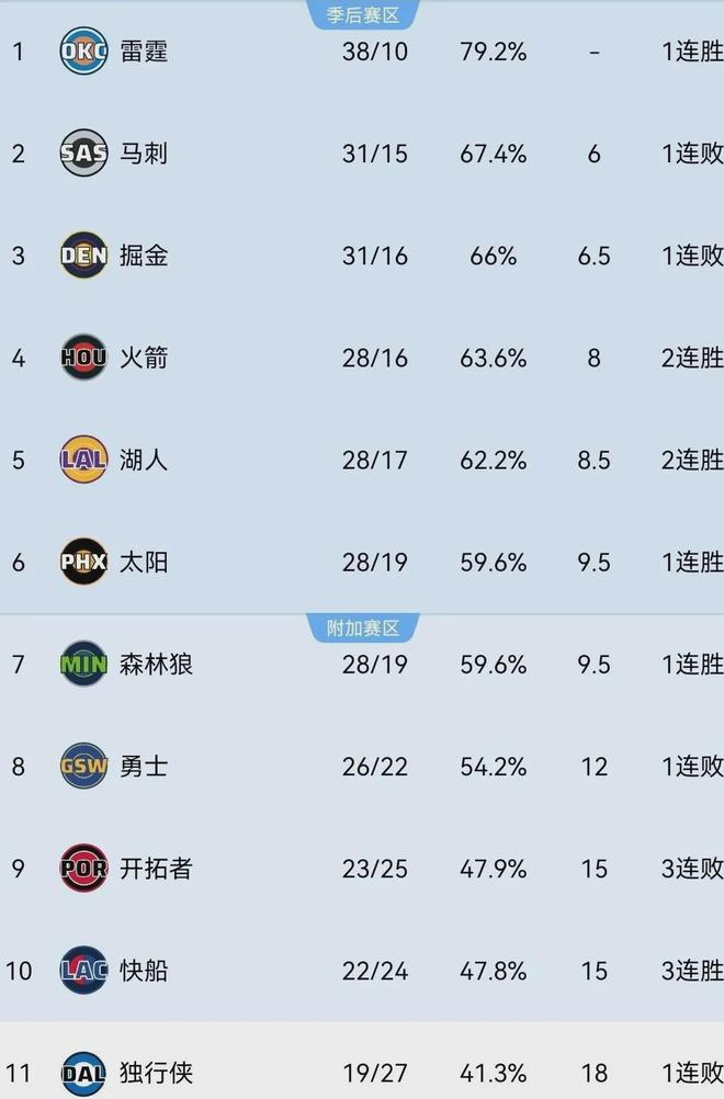 目前为止,快船以22胜24负排名西部第十,已抹平与第九的开拓者胜差数,落后第八的勇士3个胜场,领先第11的独行侠3个胜场,最起码锁定附加赛名额应该没啥问题了。