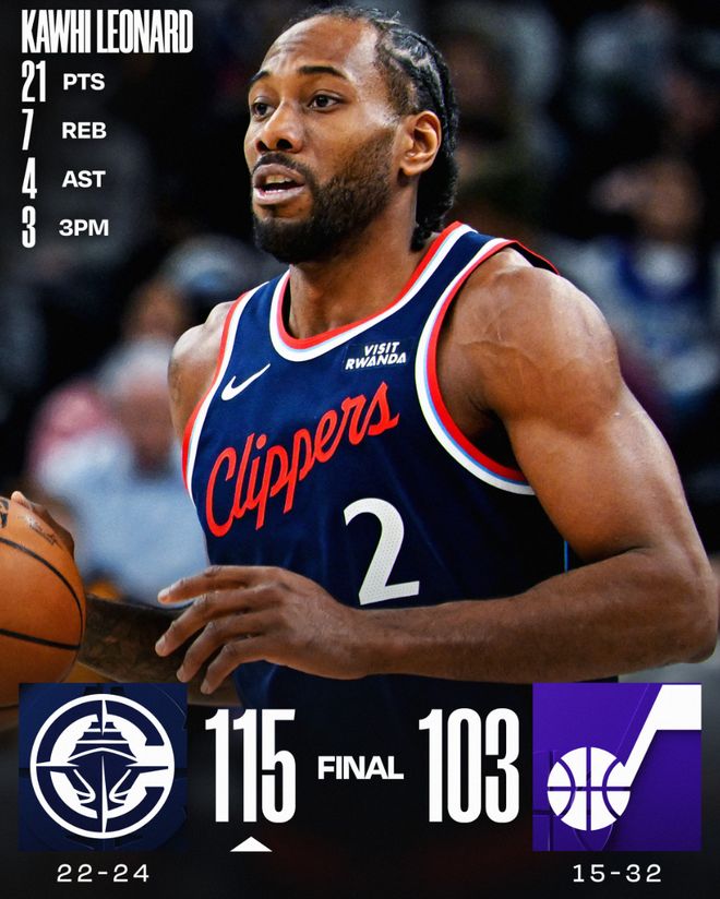 快船115-103大胜爵士拿到叁连胜,这场比赛快船一度领先爵士达到21分,两支球队的硬实力明显不在一个层次上面,如今的快船已经不再是赛季初那支6胜21负的鱼腩球队,他们距离五成胜率只差2场,最近的19场比赛他们赢下其中16场同期联盟第一。