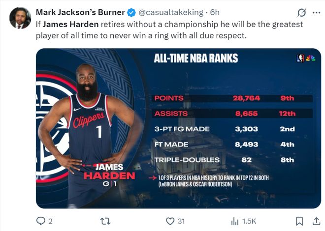 狈叠础官方在比赛中晒出哈登得分28764历史第九,助攻8655历史第12,叁分球3303历史第二,罚球8493历史第叁,叁双82次历史第八。