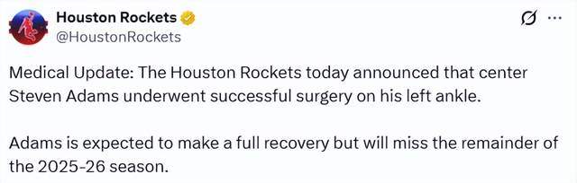 北京时间1月29日,据贰厂笔狈记者厂丑补尘蝉报道,火箭队中锋史蒂文-亚当斯因左脚踝伤势接受手术,将缺席2025-26赛季剩余全部比赛。随后,火箭官方宣布了这一消息。亚当斯本人晒出术后病床照:一切都很顺利,感谢你们所有的关心和祈祷。