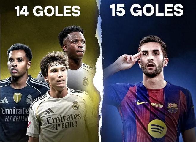 本赛季到目前为止,目前身价只有5000万欧元不到的费兰托雷斯各项赛事中为巴萨打入15个进球,而反观皇马三位前锋维尼修斯、罗德里戈和贡萨洛加西亚的进球总和只有14球。这位25岁的西班牙前锋在各项赛事中为巴萨出战26场,其中19次首发,累计登场1569分钟,攻入15球并贡献1次助攻。相比_x0008__x0008_之下,身价1.5亿欧元的25岁巴西球星维修斯,本赛季代表皇马出战28场24次首发,2112分钟贡献6球;身价6000万欧元巴西前锋罗德里戈,本赛季代表皇马出战24场9次首发,1013分钟仅打入3球; 21岁的皇马自家青训小将贡萨洛加西亚,本赛季代表皇马出战21场13次首发,674分钟收获5球。