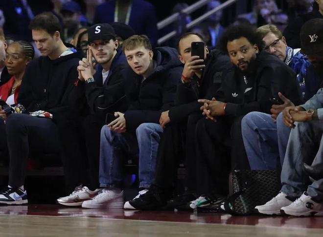现场不乏足坛以外的重量级人物。皇马名宿马塞洛坐在赖斯左侧数席位置观赛。