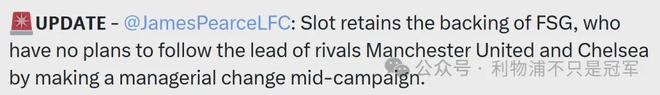 我想,芬威不是看不到利物浦的问题,更不可能对目前的竞技表现满意,_x0008__x0008_之所以仍支持斯洛特,是因为他们同时也看到了球队在本赛季所面临的各种困难。