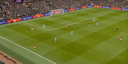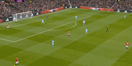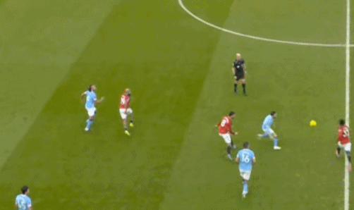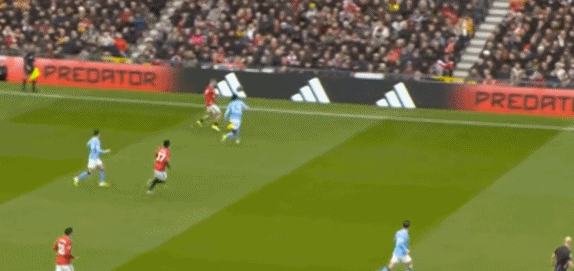 反击的起跑线前,曼联甚至无需额外自己制造空间,只需要姆贝乌莫和布鲁诺不断移动,在罗德里身侧、中卫身前的区域就有很大的机会接到球,紧接着就可以联系到多尔古和阿玛德-迪亚洛所在的边路,就可以带着速度和冲击力冲向曼城的门前。