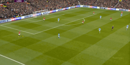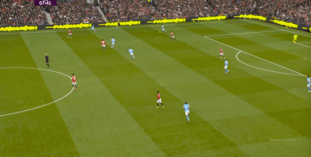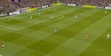 这也使得曼联在开场只有2分钟的时候,就用两次长球直打,直接进入了曼城的禁区线空间内: