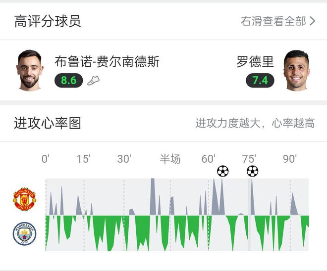 这个时候,你再来看曼联和曼城在“进攻心率图”上的表现: