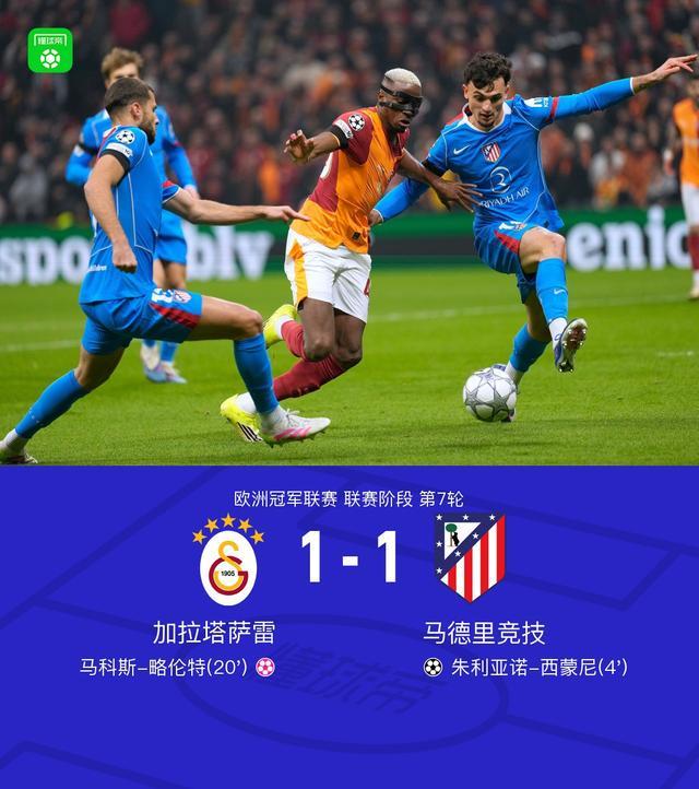 北京时间1月22日,欧洲冠军联赛联赛阶段第7轮,加拉塔萨雷与马德里竞技展开对决。上半场鲁杰里传中,朱利亚诺-西蒙尼头球闪击,_x0008__x0008_之后绍洛伊传中,略伦特自摆乌龙。最终马竞客场1-1战平加拉塔萨雷。