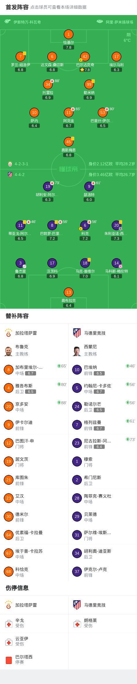 第20分钟,绍洛伊传中,略伦特自摆乌龙,加拉塔萨雷1-1马竞
