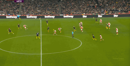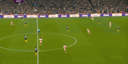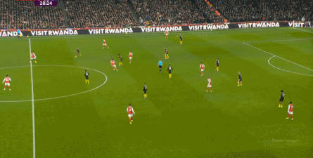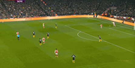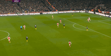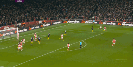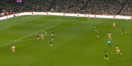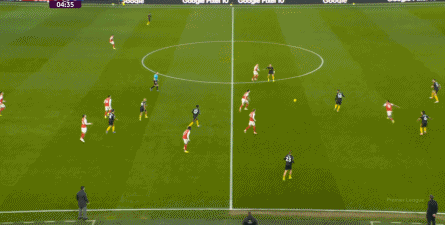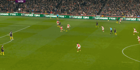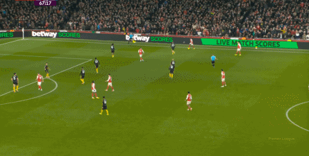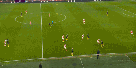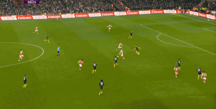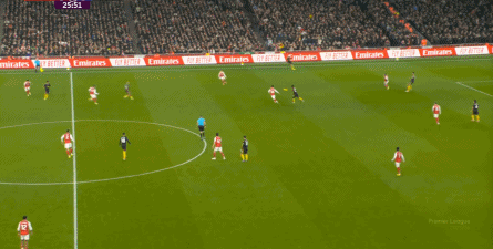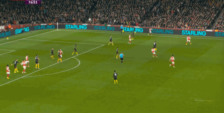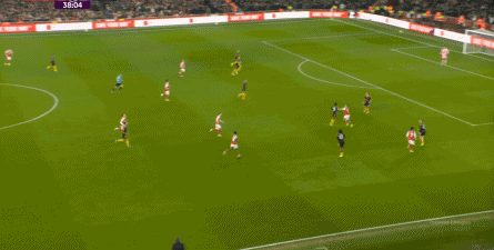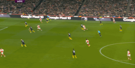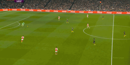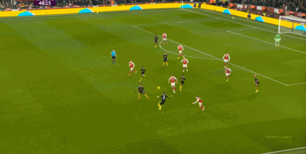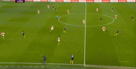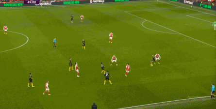 但这次进攻成型也有偶然性,因为阿森纳这一侧的中场和边后卫全部随着进攻球员压上去了,这是反击能出现的关键: