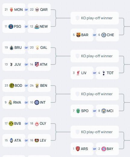 北京时间1月29日,欧冠联赛阶段结束了全部比赛的角逐。至此,欧冠淘汰赛的四大分区也正式落位完成。被本菲卡踢进附加赛的皇马将与曼城同区,巴萨、切尔西则将与大巴黎同区。
