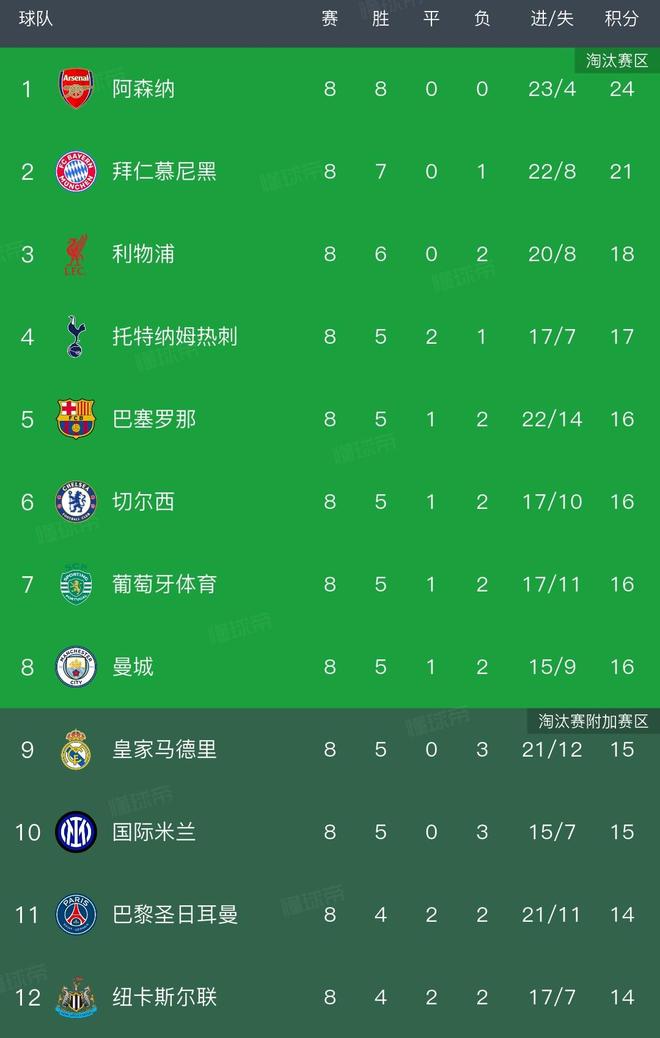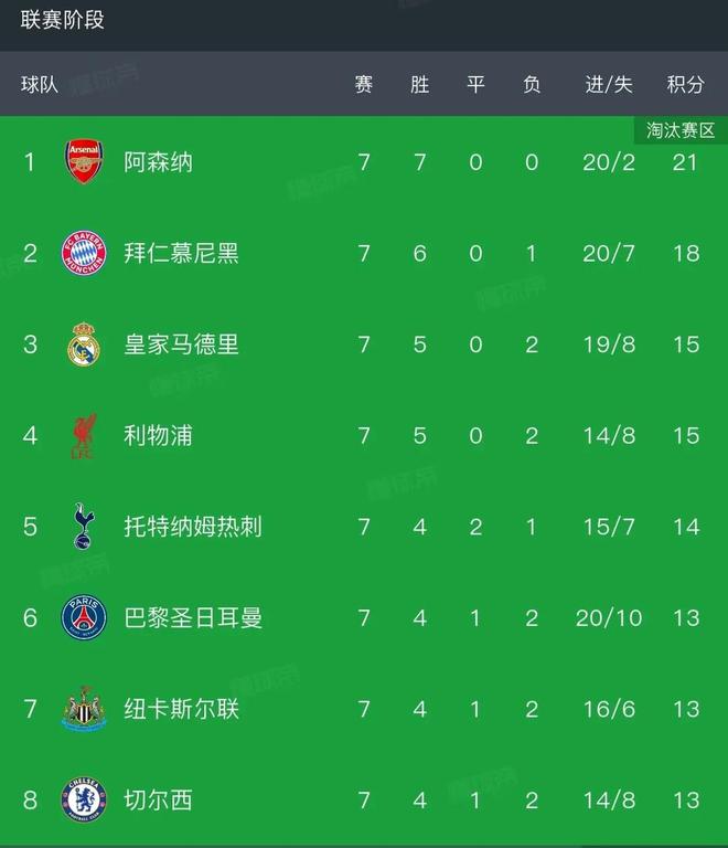 第七轮结束时,已经确定提前出线的阿森纳和拜仁排名前二,皇马和利物浦同积15分排名第叁、第四,托特纳姆热刺14分第五,而巴黎、纽卡和切尔西同积13分排名六至八名。