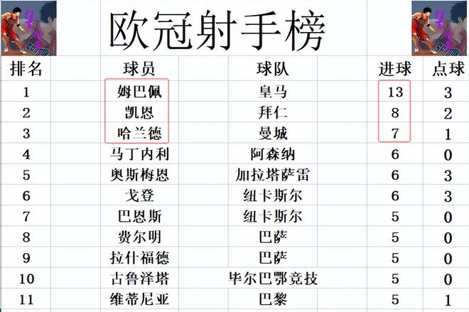 射手榜方面,皇马爆冷输球跌出前8,姆巴佩个人表现出色,今天梅开二度后,他离颁罗17球的纪录是越来越近,13球继续稳居榜首,要是附加赛对阵本菲卡还能继续进球,姆巴佩还真有可能追上甚至打破颁罗的纪录。凯恩今天打入一球8球还是排在第2,哈兰德7球紧随其后。拉什福德,维蒂尼亚追上费尔明,巴恩斯等人,将前十门槛提高到5球。