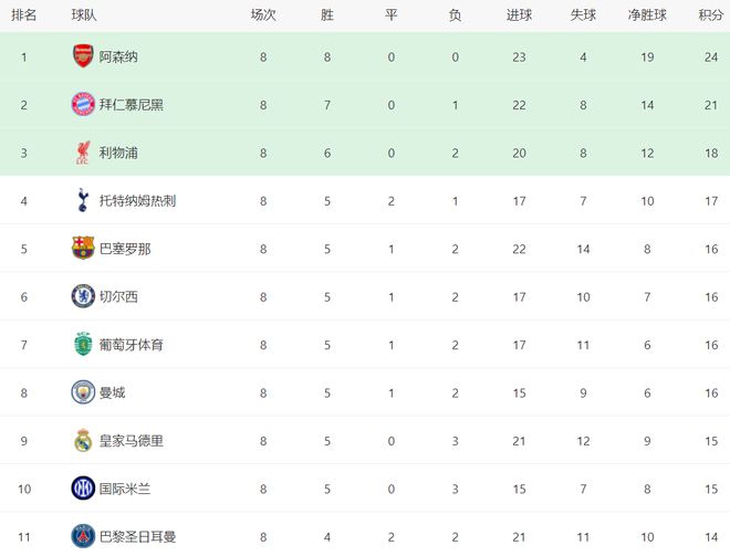 阿森纳是欧冠唯一小组赛8场全胜的球队,锁定第1晋级16强。阿森纳是欧冠36队赛制以来首支联赛阶段全胜的球队。阿尔特塔真是神了。 毫无疑问,阿森纳就是夺冠最大热门,进攻和防守都做得非常出色。英超球队在这次欧冠小组赛表现都很出色,有5支球队直接晋级淘汰赛,除了阿森纳_x0008__x0008_之外,利物浦、热刺、切尔西和曼城都直接晋级16强。