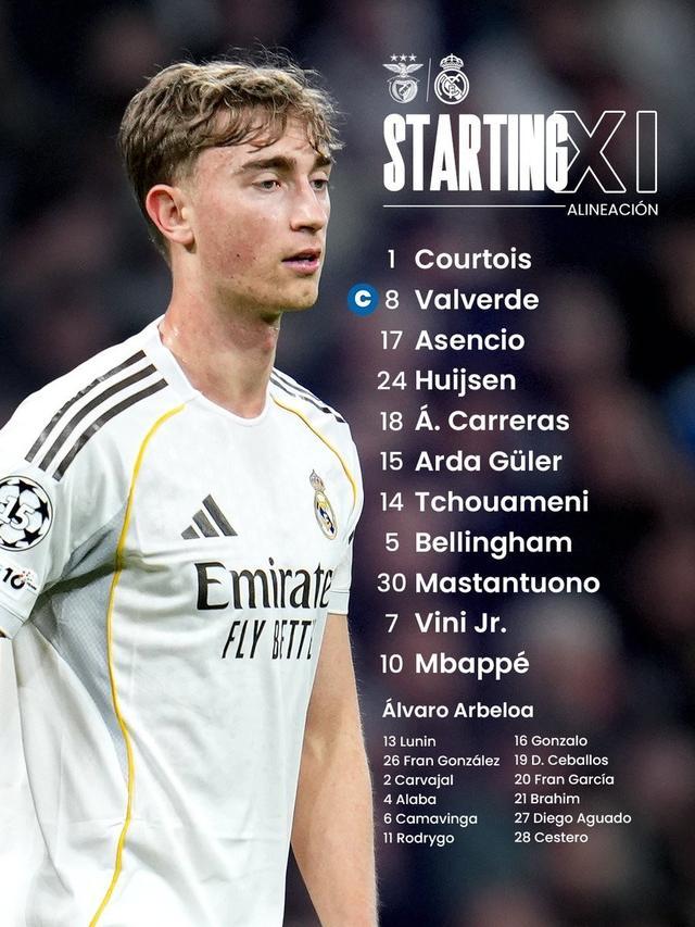 皇马客战本菲卡:姆巴佩领衔,维尼修斯、马斯坦托诺出战