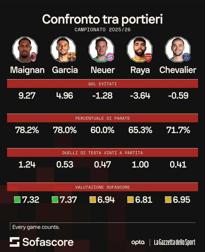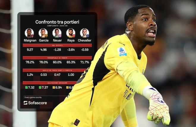 25/26赛季,米兰一门迈尼昂状态明显复苏,多次在关键比赛中力挽狂澜。据专_x0008_业机构统计,法国国门的实际失球数要比预期失球数少9.27个,该项数据排名欧洲五大联赛第1位。好消息是,米兰即将以队内顶薪与其续约至2031年。